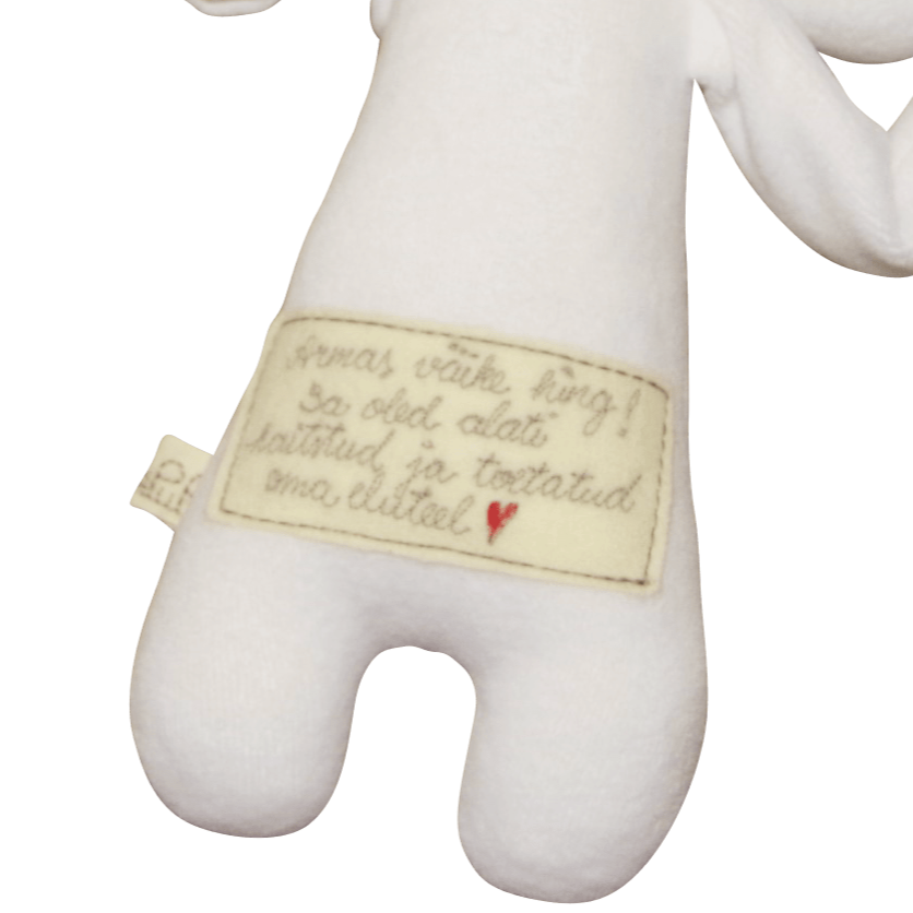 Soovi korral kirjutame jänesele ka nime, nime ja kuupäeva, nime ja südame või Sinu enda poolt valitud teksti (nt kõik lapse sünniandmed). Selleks tee palun menüüst vastav valik ja lisa soovitud tekst kasti "personaliseeringu kirjeldus".