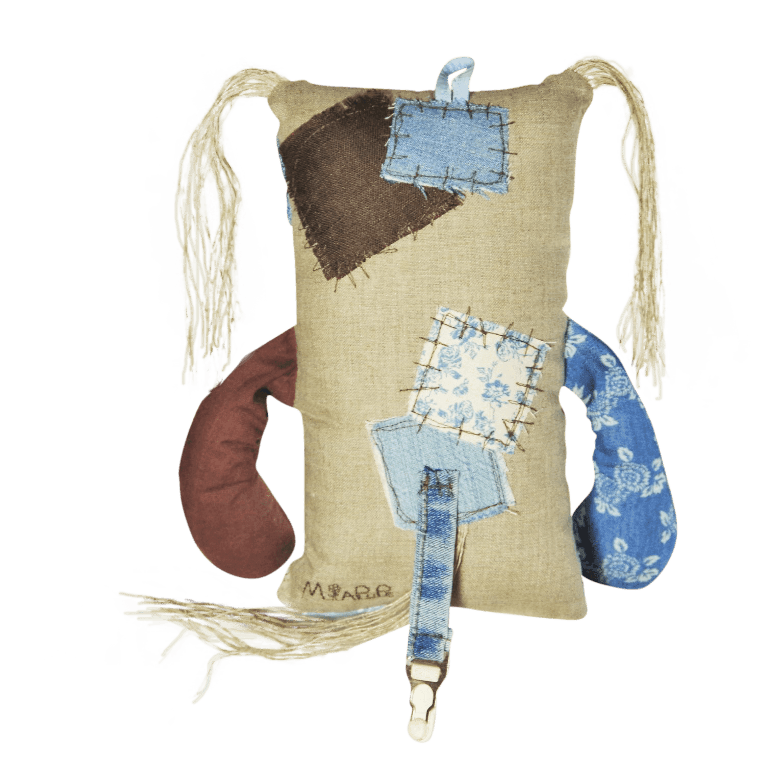 Valmistatud linasest ja puuvillasest kangast, silmadeks nööbid. Illustratsioonid on õmmeldud õmblusmasinal kasutades vabakäe tikkimistehnikat. Kratt on täidetud padjatäitega.