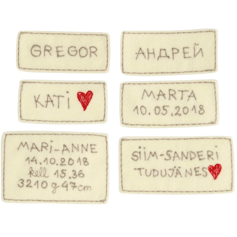Tikime personaliseeringu trükitähtedega vildile, mille õmbleme kolli pepule. Viimasel fotol on näidised sellest, millised erinevad personaliseeringu variandid välja näevad.