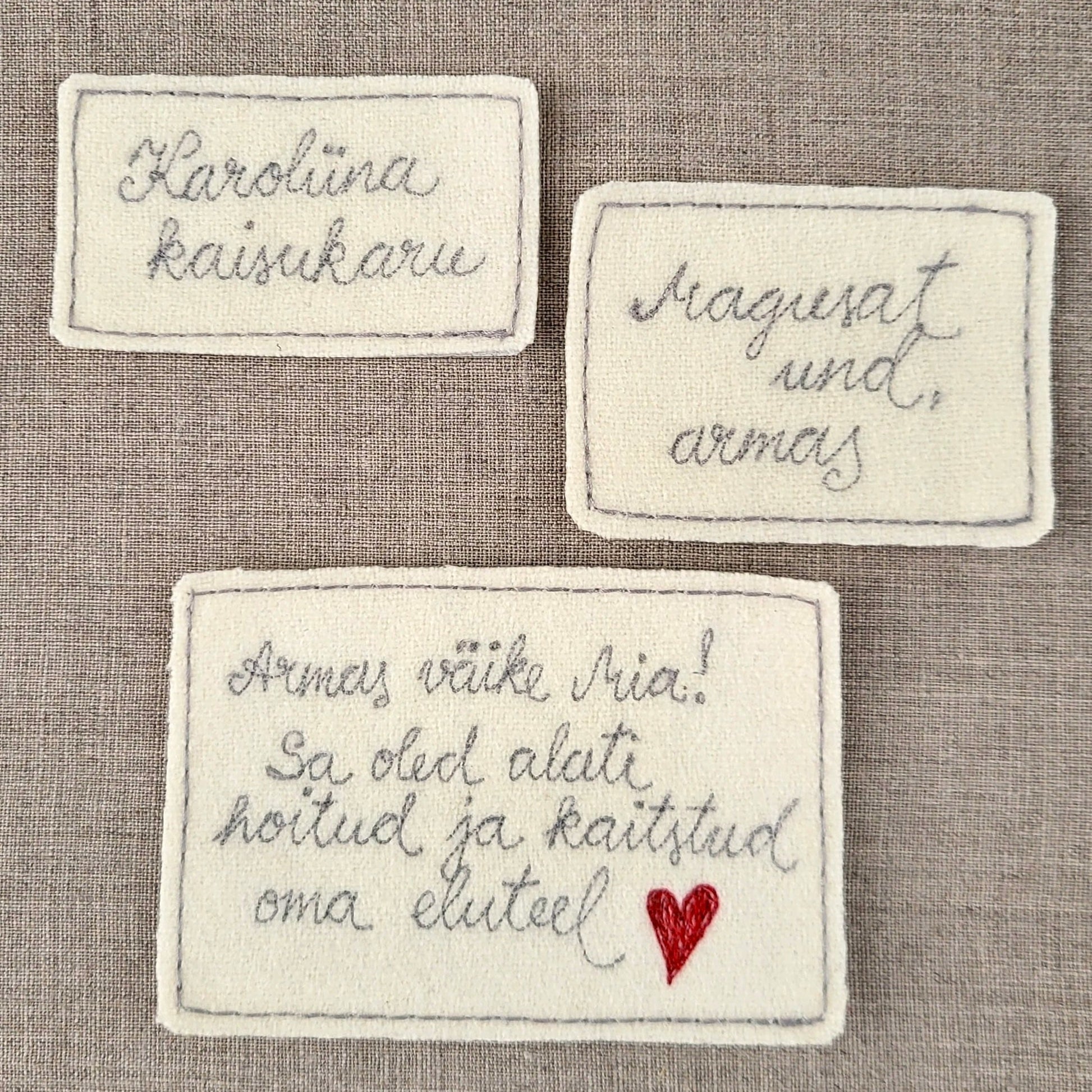 Kaisuahvile kirjutame personaliseeringu villasele kangale, mille õmbleme ahvi seljale. Viimastel fotodel on näidised sellest, kuidas erinevad variandid välja näevad.