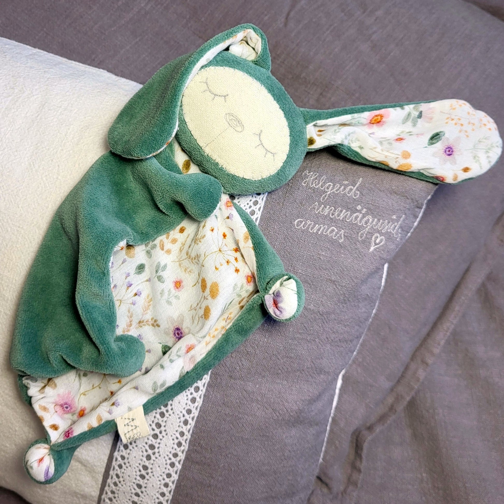 Pehme, armas ja rõõmsavärviline roheline jänese kaisulapp - turvaline kaisuloom pisikestele poistele ja tüdrukutele. Armas nimeline katsikukingitus.